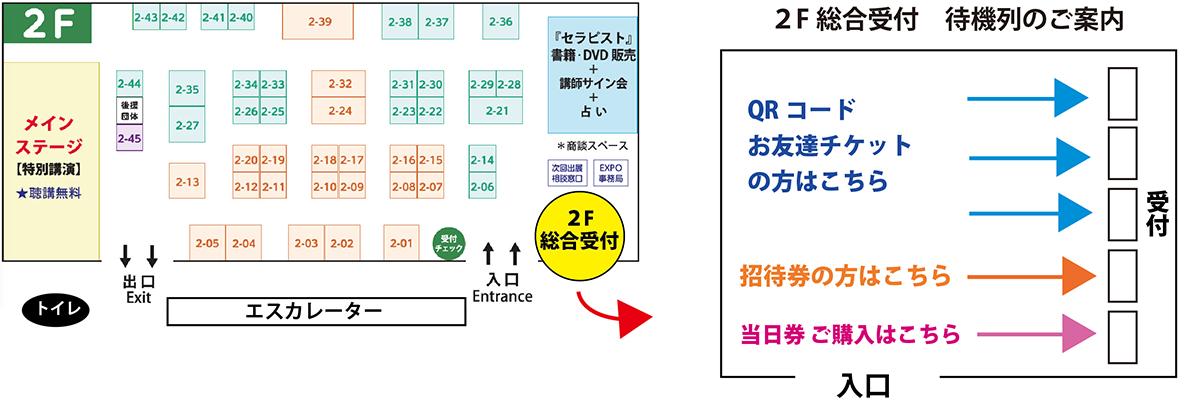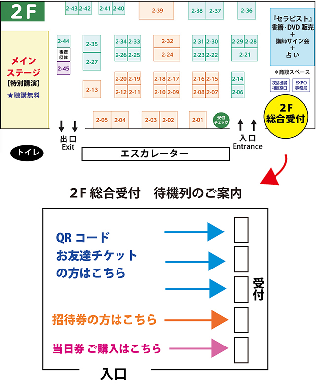 - 必ず「2F総合受付」にて、全ての会場に入場できる当日有効の『EXPO 入場パス』をまずお受け取りください。